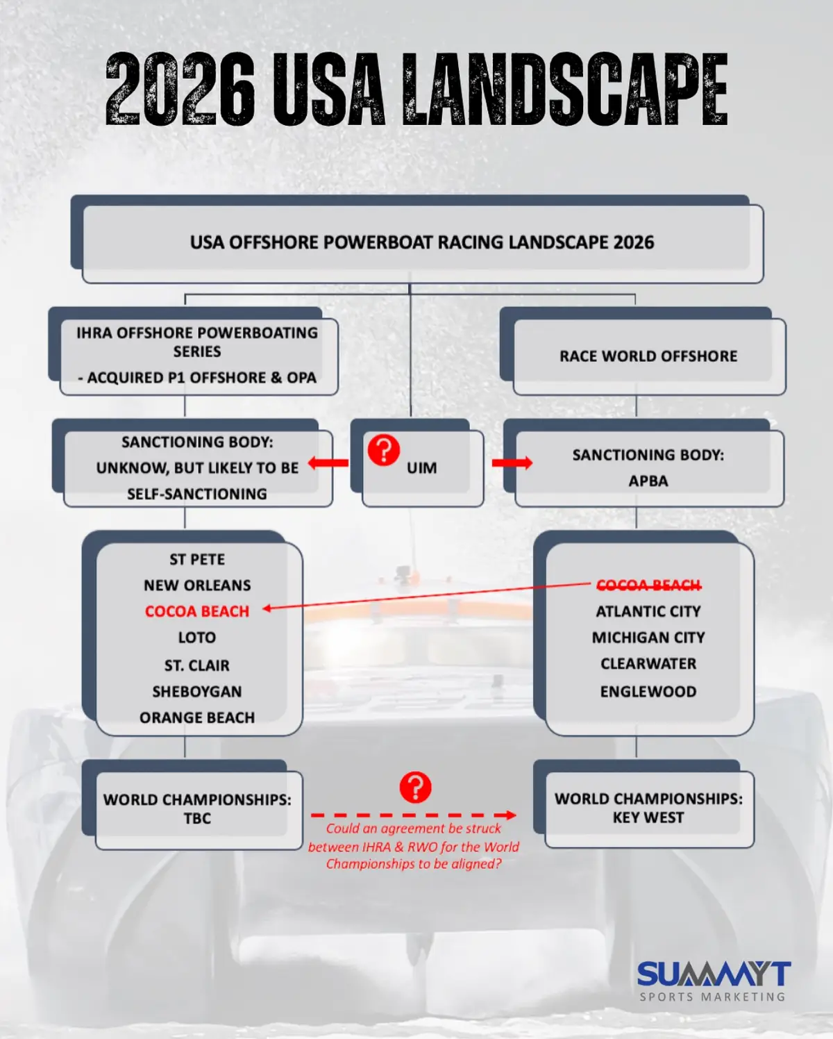 Thunder on Cocoa Beach appeared on APBA’s 2026 schedule when announced in November but switched to IHRA days before Gregory’s post, removing a marquee venue from APBA’s calendar. Kerry Bartlett of the Cocoa Beach organizing committee said: “When we agreed to work with APBA, we were working with the best information we had at the time. Circumstances have changed substantially since then.”
