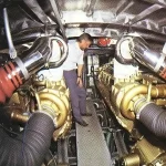 His contribution went beyond the hull. Challenger II was fitted with Levi Drive Units – a development of his surface propeller transmission system, running the propellers semi-submerged at the surface rather than fully beneath the water. The engine exhausts exited immediately in front of the propellers, helping water break away cleanly as the boat came onto the plane. A semi-circular cowl around the upper half of each propeller captured the thrust to generate additional drive astern. Twin five-bladed surface-piercing propellers were driven by twin 2,000hp MTU V12 396 TB92 diesel engines at 2,100rpm. MTU had agreed to run these units at 120 per cent of rated output continuously for 72 hours without affecting the warranty. Total fuel capacity was 13.5 tonnes, held in four foam-filled Marston Palmer bag tanks amidships plus a bow trimming tank of 320 gallons.