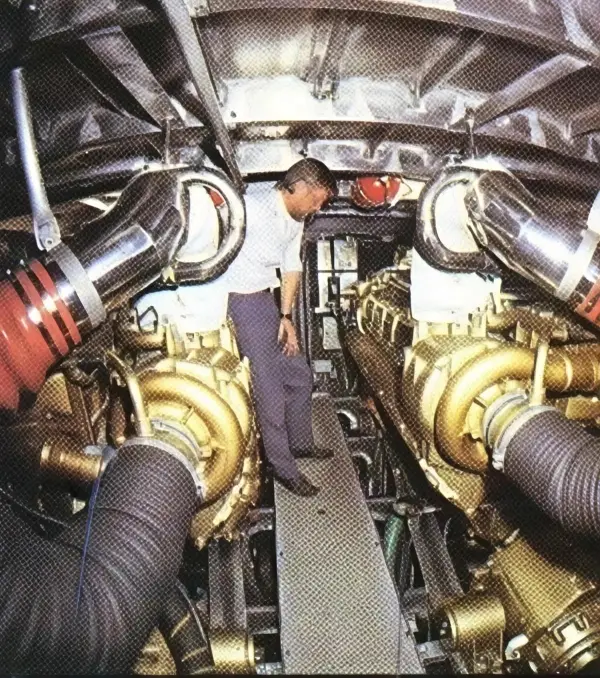 His contribution went beyond the hull. Challenger II was fitted with Levi Drive Units – a development of his surface propeller transmission system, running the propellers semi-submerged at the surface rather than fully beneath the water. The engine exhausts exited immediately in front of the propellers, helping water break away cleanly as the boat came onto the plane. A semi-circular cowl around the upper half of each propeller captured the thrust to generate additional drive astern. Twin five-bladed surface-piercing propellers were driven by twin 2,000hp MTU V12 396 TB92 diesel engines at 2,100rpm. MTU had agreed to run these units at 120 per cent of rated output continuously for 72 hours without affecting the warranty. Total fuel capacity was 13.5 tonnes, held in four foam-filled Marston Palmer bag tanks amidships plus a bow trimming tank of 320 gallons.